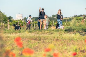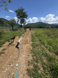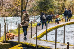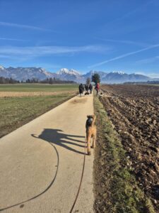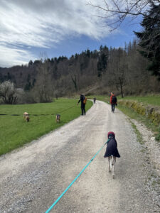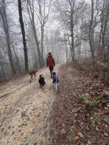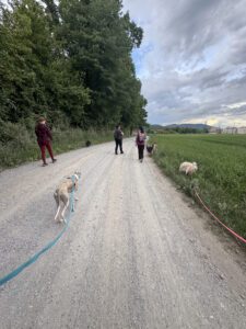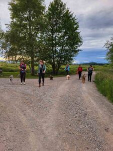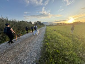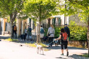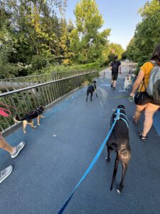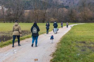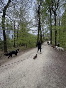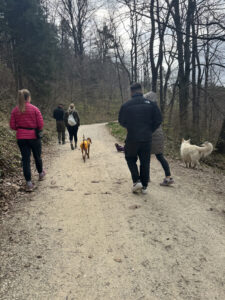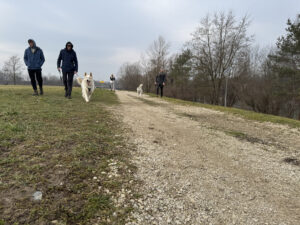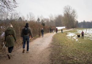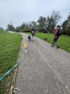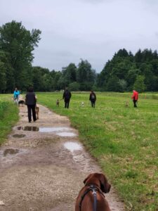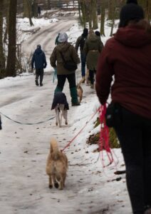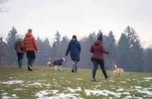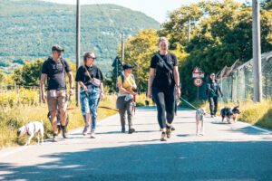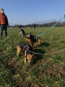 Je skupinski sprehod, kjer so psi lahko psi, izveden pod nadzorom. Psi so na udobni opremi in se učijo: